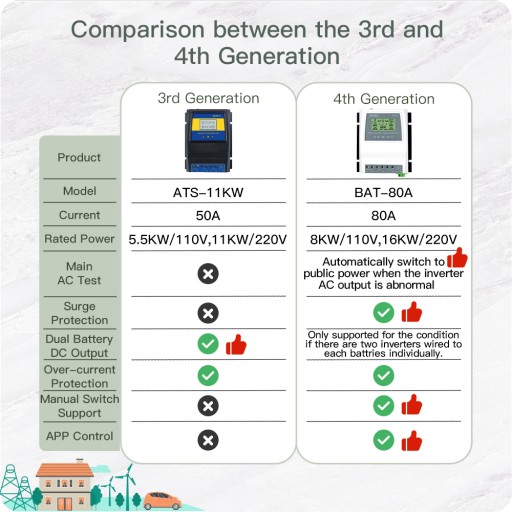 Szybki czas transferu: transfer falownika do zasilania publicznego ≤10ms, transfer zasilania publicznego do falownika ≤16ms