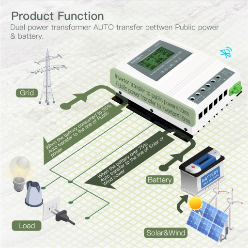 【W pochmurne lub bezwietrzne dni, gdy poziom naładowania baterii jest niski, automatycznie przełączy się na zasilanie sieciowe, aby chronić baterię, szczególnie w przypadku, gdy napięcie baterii jest niższe niż punkt odcięcia, automatycznie przełączy się z powrotem na zasilanie bateryjne, gdy bateria napięcie jest wyższe niż punkt przywracania, działa jak UPS w przeciwnym kierunku ze zaktualizowaną funkcją przełączania ręcznego dla Twojej wygody.】