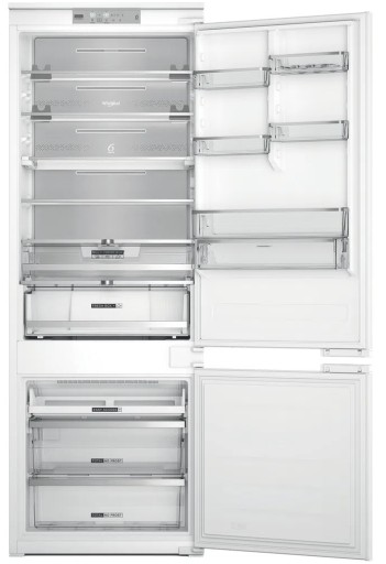 Cechy lodówko-zamrażarki do zabudowy Whirlpool: kolor biały. Wysokie urządzenie spełniające potrzeby całej rodziny. Szklane półki zapewniają wytrzymałość i elegancję. Wentylator zapewnia płynny i równomierny przepływ powietrza we wnętrzu urządzenia w celu zapewnienia udoskonalonej wentylacji. Czujniki 6-ty Zmysł automatycznie obniżają temperaturę w lodówce po włożeniu nowych produktów, zmniejszając zużycie energii.