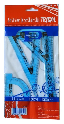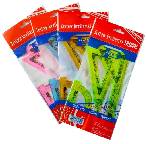 Zestaw kreślarski zawiera: linijkę 16cm, ekierkę ze skalą 10 cm i 14 cm, kątomierz 180 stopni.