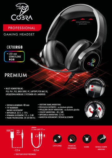Słuchawki COBRA CR700 RGB z końcówką USB-A i jack 3,5 mm, przejściówka 2x 3,5 mm na 1x 3,5 mm i dokumentacja.