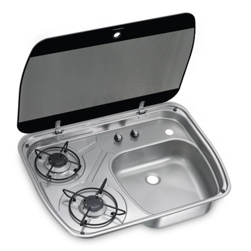 Zlew z kuchenką gazową oraz pokrywą wykonaną z bezpiecznego żaroodpornego szkła. Zestaw posiada odłączane podpórki na naczynia, nasadki palnika oraz zawory odcinające dopływ gazu w przypadku zalania lub zdmuchnięcia płomienia. Zestaw zawiera syfon i gumowy korek. Krany do nabycia osobno (również w naszej ofercie).