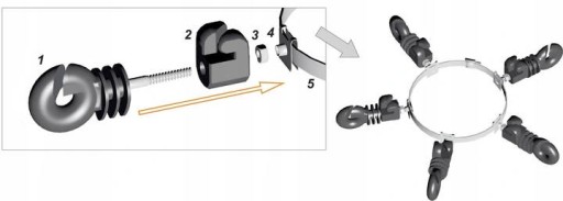 Montaż pastucha rynnowego na kuny należy rozpocząć od rozmieszczenia na rynnach spustowych obejm (5) wraz z nasadkami mocującymi do izolatora M6 (4), nakrętkami (3), izolatorami G264 (2) oraz izolatorami z gwintem metrycznym M6 (1).