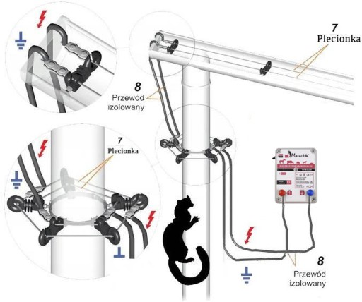 Od elektryzatora (7) do obejm z izolatorami prowadzimy 2 kable wysokiego napięcia. A przez izolatory przeciągamy linkę-plecionkę.
