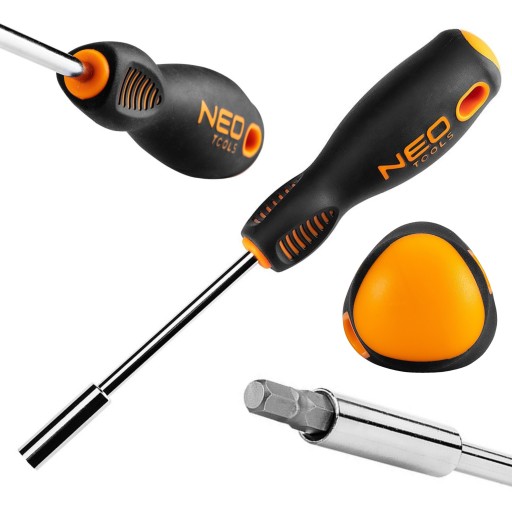 Uchwyt do bitów, rękojeść wkrętakowa 06-074 marki NEO to narzędzie przeznaczone do wkręcania bitów, cechujące się szeroką uniwersalnością. Posiada wygodną rękojeść wkrętakową, której nadano trójgraniasty, ergonomiczny kształt. Dodatkowo, znalazło się w niej wyprofilowane oparcie dla kciuka, które wpływa na mniejsze obciążenie dłoni podczas wykonywanych zadań oraz pozwala uzyskać optymalny moment obrotowy. Grot wykonano ze stali węglowej, z kolei uchwyt pokryto tworzywem TPR - odpornym na działanie chemikaliów, smarów i olejów mineralnych. Produkt marki NEO przeznaczony jest dla wykończeniowców i majsterkowiczów.
