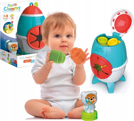 Dziecko będzie mogło wkładać klocki do miękkiego, gumowatego otworu i wyjmować je, otwierając pokrywę. Natomiast postać misia można przyczepić do klocków i włożyć do rakiety, aby była gotowa do wyruszenia do miękkiego wszechświata Clemmy!