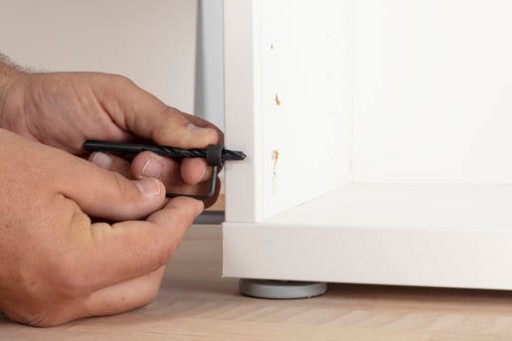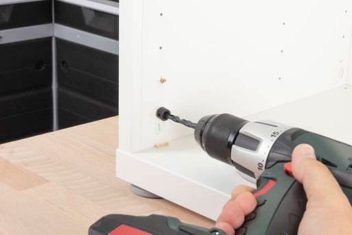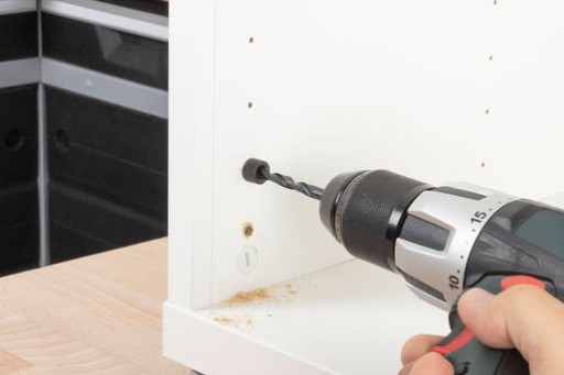 - Za pomocą dołączonego wiertła i pasującego ogranicznika głębokości rozwiercamy wyrwane otwory pod wkręty na określoną głębokość. Zapobiega to przewierceniu korpusu mebla na wylot.