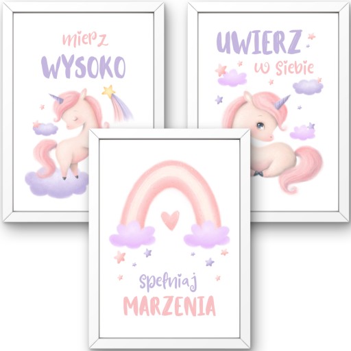 Przepiękny zestaw plakatów z motywem Magicznych Jednorożców to idealna dekoracja do pokoju każdej dziewczynki.