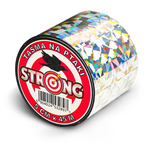 Wizualny i dźwiękowy odstraszacz ptaków marki STRONG dostępny jest w opakowaniu zawierającym rolkę, na którą nawinięte jest 45 metrów taśmy. Jej szerokość wynosi 5 centymetrów, co zapewnia dobrą widoczność i skuteczność działania na różnorodnych obszarach. Długi odcinek taśmy odblaskowej umożliwia pokrycie znacznych terenów, zapewniając wszechstronną ochronę przed licznymi gatunkami ptaków.