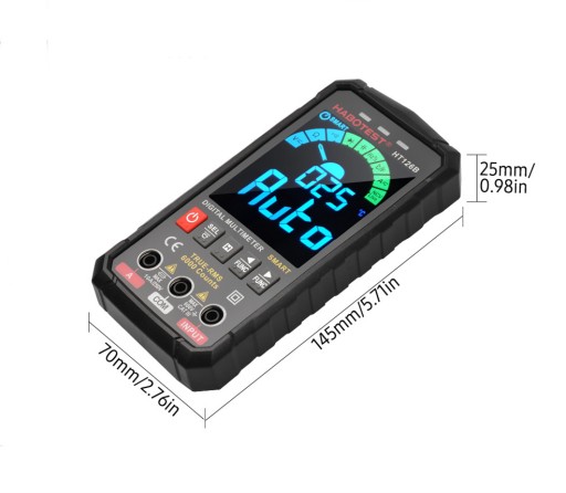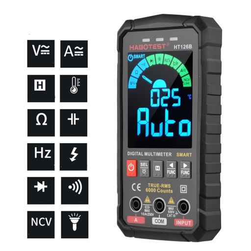 HT126B to inteligentny i wytrzymały multimiernik marki Habotest. Wyróżnia się precyzją pomiarów, możesz z niego korzystać również na zewnątrz. Wyposażony w duży, kolorowy wyświetlacz oraz silikonowe przyciski - jest prosty i wygodny w użytkowaniu. Kompaktowy i lekki - ma także latarkę LED, która umożliwia pracę również w ciemnych miejscach. Do jego zasilania potrzebne są 4 baterie AAA 1.5 V (brak w zestawie). Za jego pomocą dokonasz pomiaru napięcia, oporu, pojemności, itp.