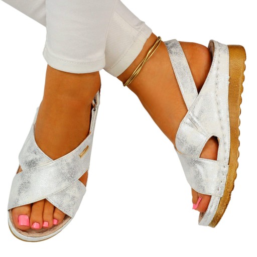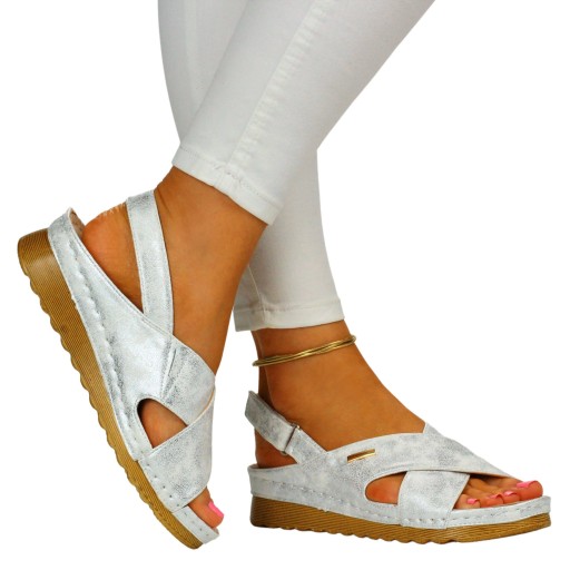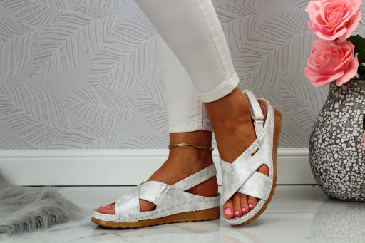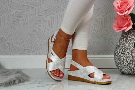 Damskie sandały w kolorze srebrnym na niskim koturnie. Prosty fason sprawia, że idealnie sprawdzą się jako obuwie codzienne. Zapięcie na rzep ułatwia nakładanie obuwia. Profilowana, skórzana, miękka wkładka zapewnia komfort użytkowania.