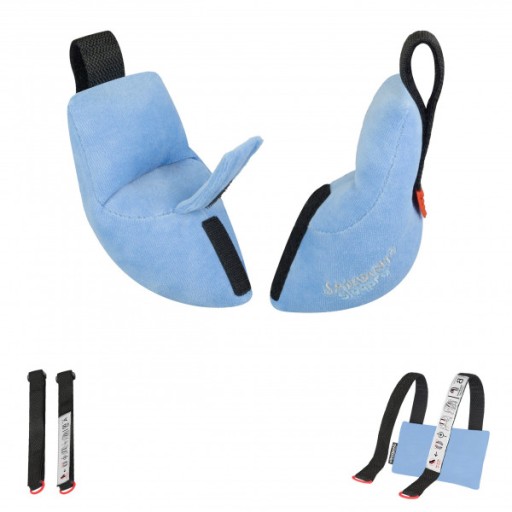 1. Z przeciwwagą – poduszkę zamontowaną w ten sposób można również wykorzystać w wózkach spacerowych lub przyczepkach rowerowych. Przeciwwagę załączoną do zestawu zakładamy z tyłu zagłówka, fotelika lub wózka, dopinamy do niej poduszeczki, a następnie przesuwamy ją tak, aby dopasować poduszkę do dziecka. Poduszeczki spinamy ze sobą pod brodą dziecka przy pomocy rzepów.