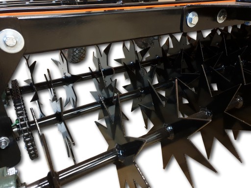 Osie aeratora jak widać na zdjęciach są łożyskowane na 6 łożyskach a cała konstrukcja jest wykonana z solidnych materiałów . Zamontowana śruba rzymska pozwala nam regulować głębokość pracy tylnej osi . Cały sprzęt malowany proszkowo. Aerator gwiazdkowy to przydatne urządzenie w każdym ogrodzie.
