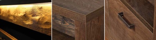 Cechą charakterystyczną mebli Indianapolis jest połączenie drewna naturalnego z płytą laminowaną oraz blaty pogrubione do 48 mm. Dodatkowo wstawka drewniana może być podświetlona oświetleniem LED.