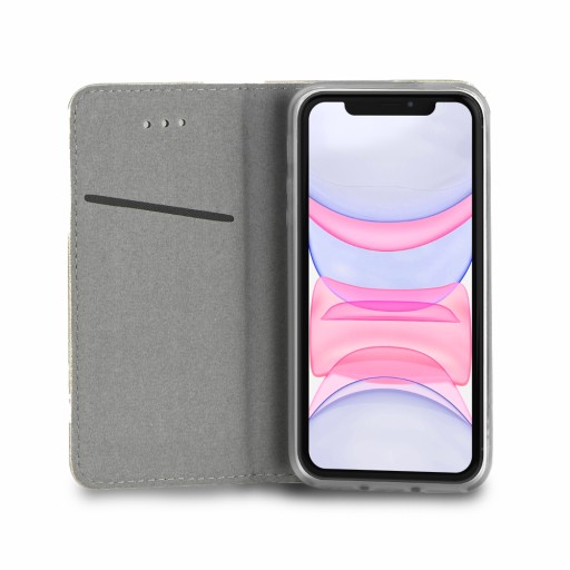 Oryginalne etui o metalizującym wykończeniu. Na zewnątrz obszyte połyskującym materiałem, w środku znajduje się zaś miękka tkanina, chroniąca ekran telefonu przed zarysowaniami. Posiada kieszonkę na podręczne dokumenty oraz zapinanie na magnes.