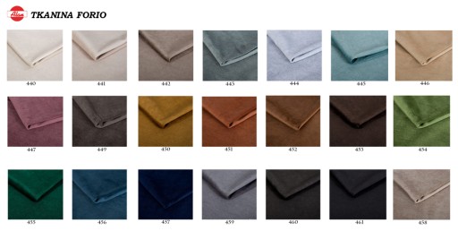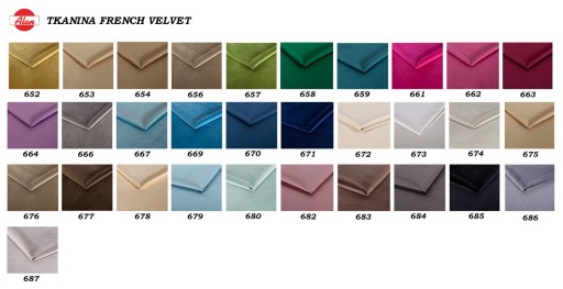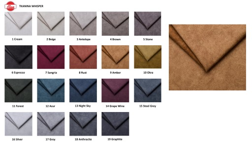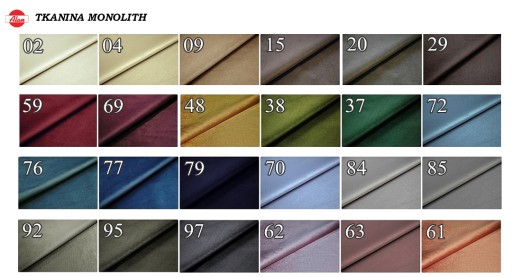 Tkanina welurowa, miękka, gładka, przyjemna w dotyku. Odporna na mechacenie i wypychanie.
