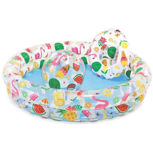 Zestaw zawiera nadmuchiwany basen o wymiarach 1222x 25 cm, pasująca piłkę o średnicy 51 cm i kółkiem do pływania 51 cm.