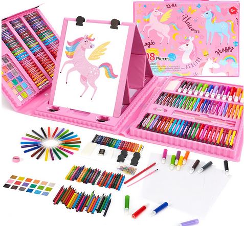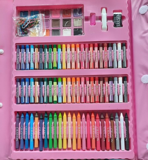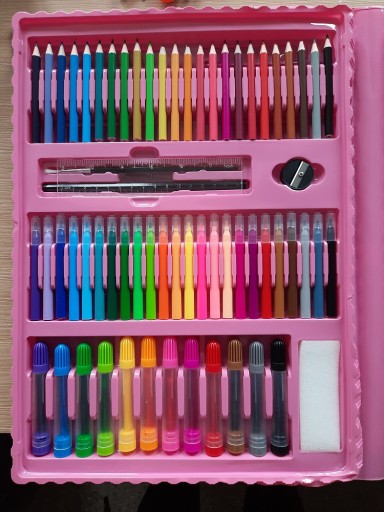 PRZENOŚNY ZESTAW ARTYSTYCZNY DLA MŁODYCH ARTYSTÓW: poręczna, przenośna walizka zawierająca szeroką gamę kolorów (208 sztuk) w różnych mediach: pisaki, kredki, pastele olejne, kredki, krążki akwarelowe, spinacze, płynny klej, temperówka, gumka, HB ołówek, pędzel, kartki papieru. Idealny artysta, który rośnie wraz z dzieckiem i jego umiejętnościami artystycznymi.