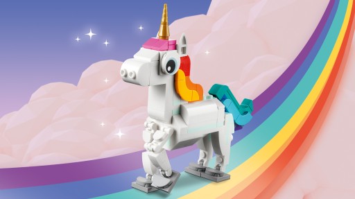 Dzięki temu zestawowi konstrukcyjnemu 3 w 1 Magiczny jednorożec (31140) kreatywne dzieci w wieku od siedmiu lat mogą przenieść się do mitycznej krainy, gdzie będą odgrywać emocjonujące historie. Zestaw zawiera jednorożca ze złotym rogiem, kolorowym ogonem oraz ruchomymi nogami i kopytami. Można go prezentować w dwóch różnych pozycjach: może stać na czterech nogach lub na dwóch tylnych nogach, aby uzyskać kultową pozę na tęczowej podstawce.