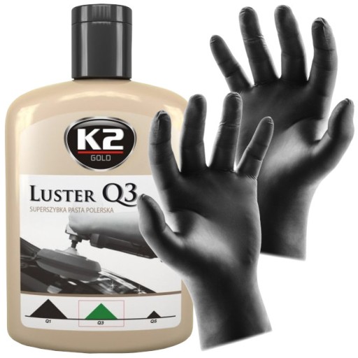 K2 LUSTER Q3 to pasta do maszynowego polerowania lakieru. Usuwa rysy po papierze ściernym, myjniach automatycznych, zmatowienia, skórkę pomarańczową, oksydację, hologramy, przebarwienia. Doskonale nadaje się do polerowania świeżo nałożonych lakierów oraz do renowacji starych, zniszczonych powłok. Wytwarza mało ciepła podczas pracy, przez co nie przegrzewa powierzchni. Daje doskonałe efekty podczas stosowania w tzw. jednym kroku - tj. 1 cykl polerowania z 1 gąbka. W większości przypadków nie są potrzebne żadne dodatkowe czynności. Pasta przeznaczona jest do polerowania: lakierów samochodowych wszelkiego rodzaju, lakierów przemysłowych, reflektorów, celulozy, mebli, powierzchni syntetycznych, akryli i wielu innych.