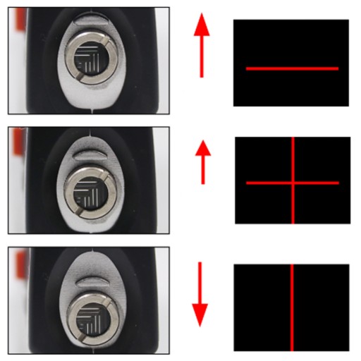 Aby przełączyć tryb świecenia, wystarczy zmienić położenie końcówki lasera: