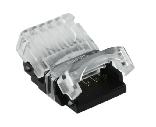 Złącze umożliwia szybkie połączenie przewodu 4-żyłowego i taśmy LED mono o szerokości 10mm WODOODPORNEJ IP65 (SMD5050 - 4pin - kolor) bez konieczności lutowania bądź używania jakichkolwiek narzędzi. Wystarczy odpowiednio umieścić taśmę i przewód oraz zamknąć zatrzask aby otrzymać solidne połączenie.