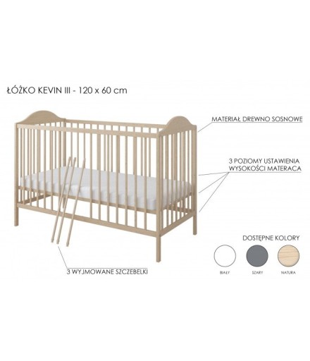 Wykonane z polskich, atestowanych materiałów - wysokiej jakości drewna sosnowego - gwarantuje wytrzymałość i stabilność. Łóżeczko niemowlęce KEVIN III posiada trzy wyjmowane szczebelki, przydatne gdy dziecko samo już wychodzi z łóżeczka i do niego wchodzi. Opcja regulowania dna łóżeczka przydaje się bardzo, gdy dziecko rośnie - a to następuje zwykle szybciej, niż się rodzice spodziewają.