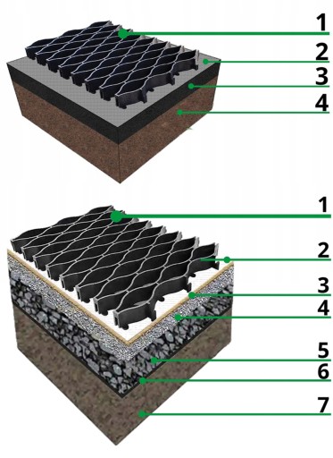 - Warstwa nośna — grubość około 15 - 30 cm z tłucznia o frakcji 32-63 mm