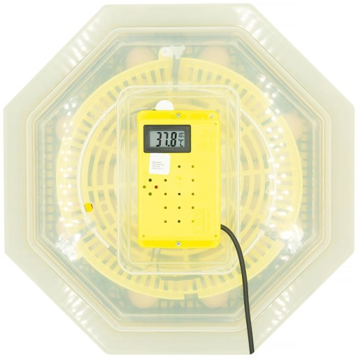 Pokrywa górna inkubatora wyposażona jest w ekran LCD, na którym wyświetlana jest aktualna temperatura oraz wilgotność procesu inkubacji.