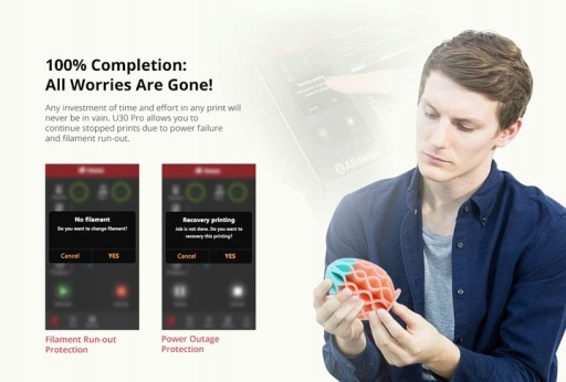 - Zabezpieczenie przed wyczerpaniem się filamentu i ochrona przed brakiem zasilania gwarantują udany wydruk