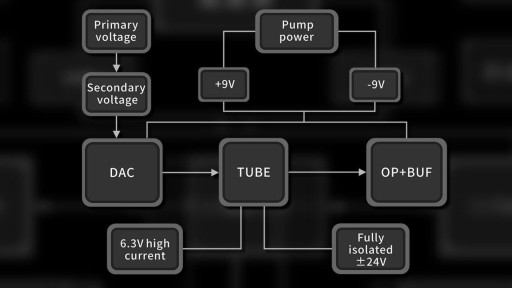 Firma aune dla Flamingo przygotowała specjalny system zasilania, którego opracowanie zajęło wiele miesięcy. To zaawansowane rozwiązanie złożone z aż pięciu modułów, dzięki czemu możliwe jest dostarczanie “czystego” prądu o odpowiednich parametrach do układu DAC, wzmacniacz OP+BUF oraz lampy, która ma dwie niezależne jednostki zasilające.