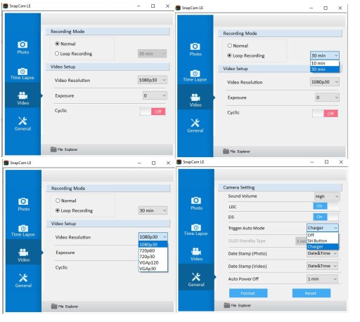 Podłączając kamerę do komputera mamy dostęp do ustawień jakości, trybów pracy itp. Załączone zrzuty przedstawiają możliwości programu.