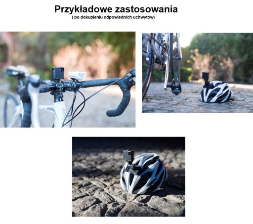 Jeśli chcesz używać kamery jako samochodowej lub rowerowej, najlepiej dokupić odpowiednie uchwyty. Urządzenie jest wyposażone uchwyt z gwintem FOTO 1/4", czyli uniwersalnym gwintem pod statywy. Zdjęcia przedstawiają przykładowe zastosowanie kamery w samochodzie, na rowerze , na kasku- uchwyty do tego typu zastosowań należy zakupic oddzielnie.