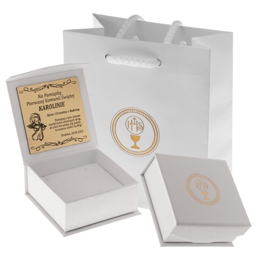 Białe pudełko prezentowe + torebka IHS - Iesus Hominum Salvator (Jezus zbawicielem ludzi)to idealny sposób na zachowanie niezapomnianej pamiątki z ważnego wydarzenia. Pudełko jest wypełnione białą gąbką, która zabezpiecza i chroni przedmioty, takie jak medalik, różaniec czy pamiątkowy naszyjnik, przed zarysowaniami i uszkodzeniami. Na wieczku pudełka znajduje się tabliczka z grawerem, którą można spersonalizować, dzięki czemu pudełko będzie jeszcze bardziej wyjątkowe. To idealny sposób na przechowanie ważnych pamiątek z pierwszej komunii świętej w eleganckim i stylowym pudełku. Pudełko zamykane jest na magnes.