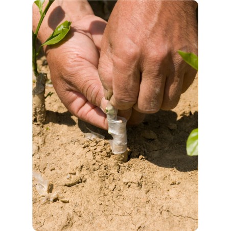 Taśma Buddy Tape nie jest klejąca w swojej normalnej przechowywanej formie, ale staje się samoprzylepna po rozciągnięciu. Pozwala to na szybką aplikację bez konieczności wiązania węzłów, a w połączeniu z mocnym uszczelnieniem stworzonym przez elastyczny charakter folii, oznacza, że pączek lub przeszczep pozostaje na miejscu nawet przy wietrznych warunkach.