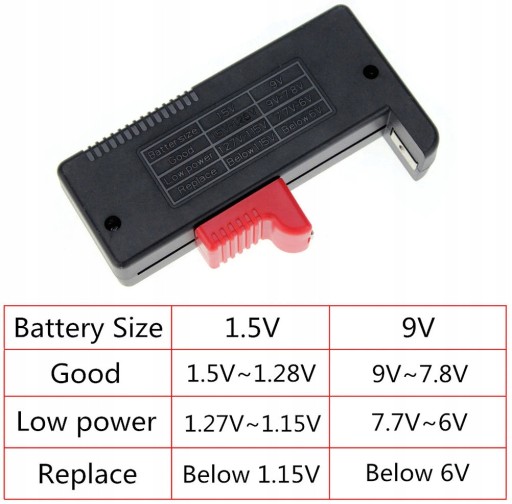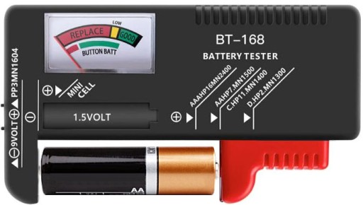 Urządzenie pozwala w bardzo łatwy sposób na sprawdzenie poziomu naładowania baterii i akumulatorków : AA R6, AAA R3, R14, R20, baterie typu pastylki 1,5V, baterie 9V (R9)