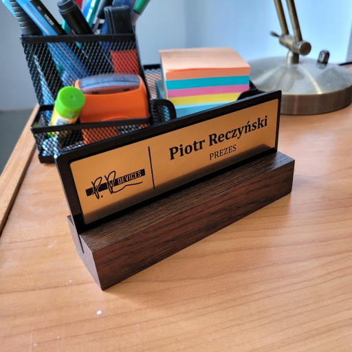 Wizytownik - Identyfikator wykonany z drewna jesionowego oraz tablicy z klasycznego czrnego laminatu grawerskiego umieszczonej na czarnym szkle akrylowym.