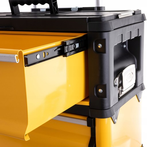 Wysokiej jakości wózek wykonany z blachy stalowej i tworzywa ABS przeznaczony do bezpiecznego przechowywania narzędzi.