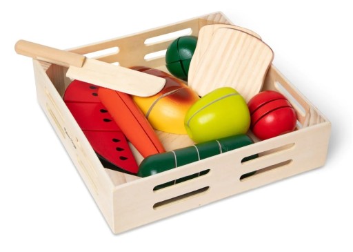 Przedstawiamy zestaw do zabawy z produktami żywnościowymi. Dzieci, które lubią obserwować co się dzieję w kuchni mogą teraz spróbować swoich sił. Dodatkową zaletą jest fakt, że elementy połączone są rzepami. Dlatego można je ponownie połączyć i bawić się od nowa. Można spróbować przygotować swoją pierwszą potrawę używając bezpiecznego nożyka, który z jednej strony działa jak prawdziwy, ale z drugiej gwarantuje, że dziecko się nie skaleczy.