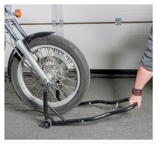 Prezentowany stojak zaprojektowany zostały do podnoszenia przedniego koła jednośladów - zwłaszcza motocykli.