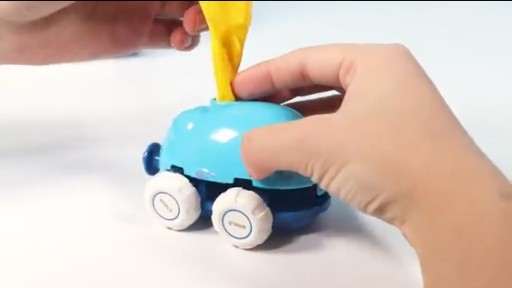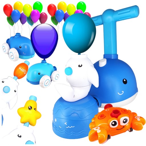- Po napełnieniu balonika powietrzem wciśnij guzik GO na wyrzutni, a autko wystrzeli jak z procy. Patrz z jaką prędkością przemierza pokój. Do wyboru autka w kształcie zwierząt morskich takich jak delfin lub krab.
