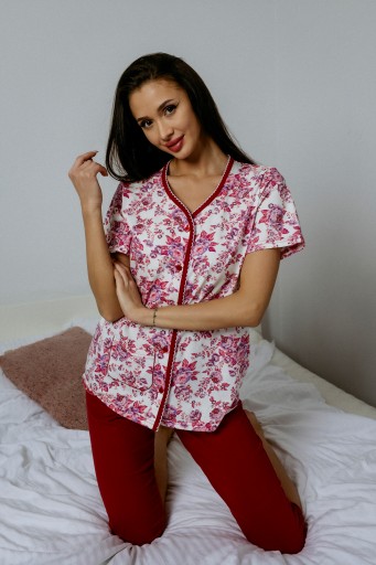 Piżama damska posiada rozpinaną po długości bluzkę w gustownym wzorze, z krótkim rękawem i haftowaną kieszonką, wykończoną lamówką z kroszetką oraz gładkie spodnie długości 3/4 o lekko zwężanym kroju.