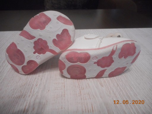 Śliczne buciki dla malutkiej dziewczynki w rozmiarze 15 o długości wkładki 10,5 cm. Buciki mają miękką i elastyczną podeszwę. Stan jak na zdjęciach. Niewielkie przytarcia na paskach zapinających co widoczne jest na zdjęciach oraz mała kreseczka zrobiona przypadkowo długopisem.