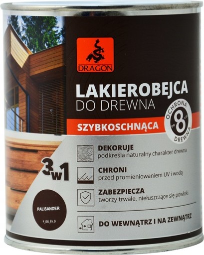 Szybkoschnaca Lakierobejca Dragon to wysokiej jakości produkt ochronno – dekoracyjny do zabezpieczenia drewna zarówno wewnątrz pomieszczeń jak i na zewnatrz. Dzięki zaawansowanej formule 3 w 1 idealnie sprawdzi sie jako produkt, który impregnuje drewno, nadaje kolor i chroni na lata.