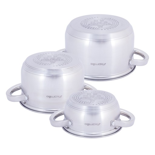 Komplet garnków 6 elementów (1.0L/14*9.5cm, 2.1L/16*10.5cm, 2.9L/18*11.5cm) z pokrywami szklanymi. Wykonane ze stali nierdzewnej, pusti uchwyty. Wewnątrz garnków znajduje się skala pomiarowa. Nadają się do wszystkich rodzajów kuchenek