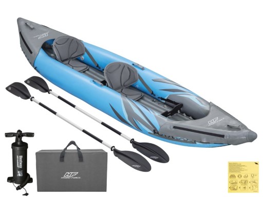W zestawie znajdują się dwie wyjmowane płetwy w różnych rozmiarach, które zapewnią wsparcie kierunkowe w różnych warunkach wodnych oraz dwa podnóżki, dzięki którym wiosłowanie będzie jeszcze bardziej efektowniejsze. Podłoga w kajaku jest nadmuchiwana. Dla komfortu użytkowania wyposażony został w nadmuchiwane siedzenia z oparciem. Transport kajaka nie będzie problemem - został wyposażony w uchwyty, a ponadto jest lekki. Posiada zawór bostoński, który umożliwia szybkie pompowanie i szybkie spuszczanie powietrza z kajaku. Został wyposażony w wiosła i pompkę tłokową. Dodatkowo w zestawie znajduje się łatka naprawcza, dzięki której naprawisz ewentualne, drobne uszkodzenie.