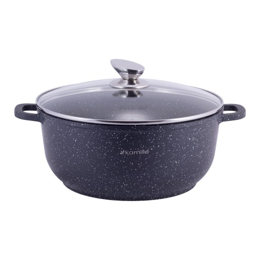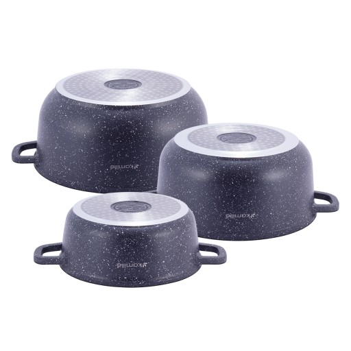 Komplet garnków 6 elementów (2.3L, 4.5L, 6.5L) z pokrywami szklanymi. Wykonane z odlewu aluminium z powłoką marmurową nieprzywierającą. Nadają się do wszystkich rodzajów kuchenek