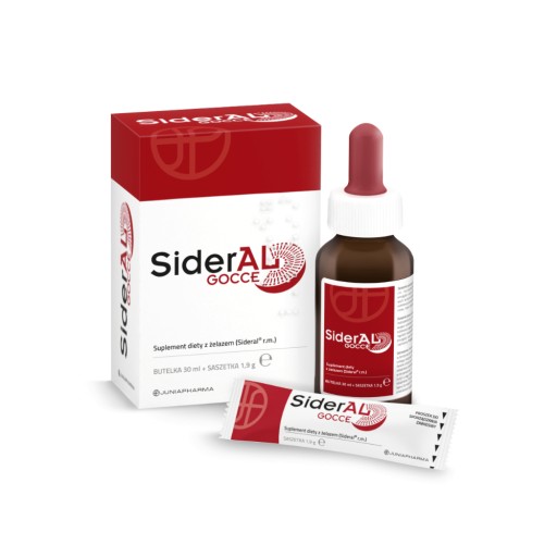 Sideral® Gocce to suplement diety zawierający żelazo (Sideral® r.m. - Sucrosomial® Iron) przeznaczony do stosowania doustnego. Suplement jest przeznaczony do uzupełnienia żelaza, w przypadku gdy jego spożycie z dietą jest niewystarczające lub zapotrzebowanie organizmu na ten składnik jest zwiększone.Żelazo jest m.in. niezbędne dla prawidłowego rozwoju funkcji poznawczych u dzieci. Żelazo przyczynia się do utrzymania prawidłowego metabolizmu energetycznego, pomaga w prawidłowym transporcie tlenu w organizmie, pomaga w prawidłowym funkcjonowaniu układu odpornościowego, przyczynia się do zmniejszenia uczucia zmęczenia i znużenia oraz odgrywa ważną rolę w procesie podziału komórek.