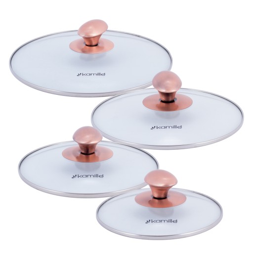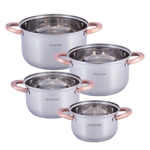 Komplet garnków 8 elementów (1.5L/16*9.5cm, 2.0L/18*10.5cm, 3.0L/20*11.5cm, 5.0L/24*13.5cm) z pokrywami szklanymi. Wykonane ze stali nierdzewnej, puste uchwyty. Wewnątrz garnków znajduje się skala pomiarowa. Nadają się do wszystkich rodzajów kuchenek