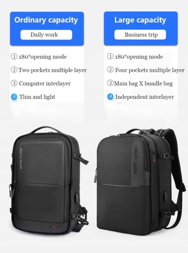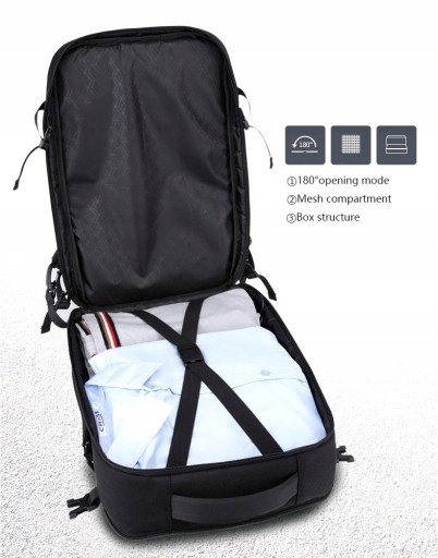 Plecak składa się z dwóch części, które można w łatwy sposób ze sobą połączyć. Pierwsza część to pojemny plecak, który można rozłożyć na płasko jak walizkę i zapakować do niego ubrania na kilkudniowy wyjazd lub używać na co dzień. Druga część jest przeznaczona na laptopa oraz akcesoria. Do każdej z części można przypiąć szelki i używać jako plecaka. W ten sposób masz do dyspozycji dwa plecaki, które za pomocą zamka można połączyć w jeden duży.